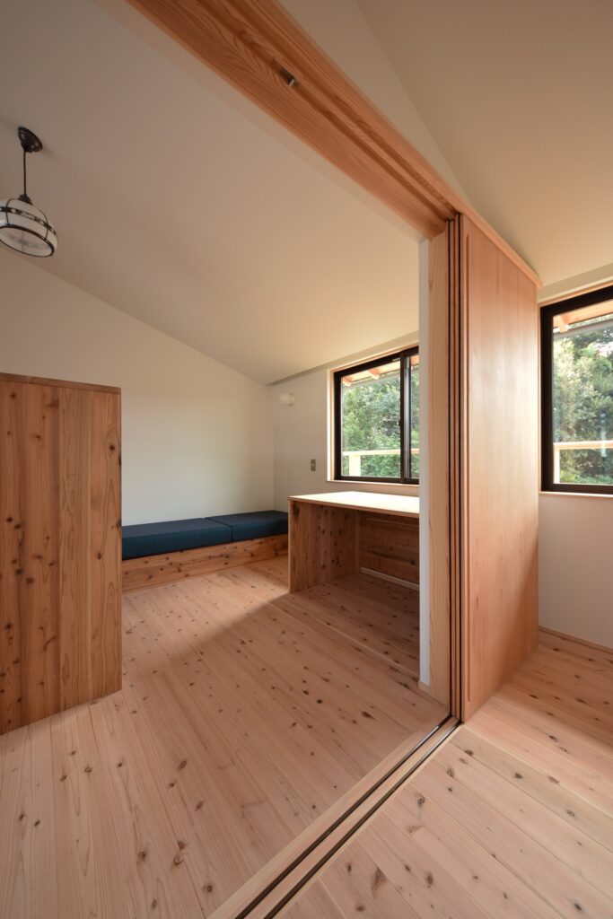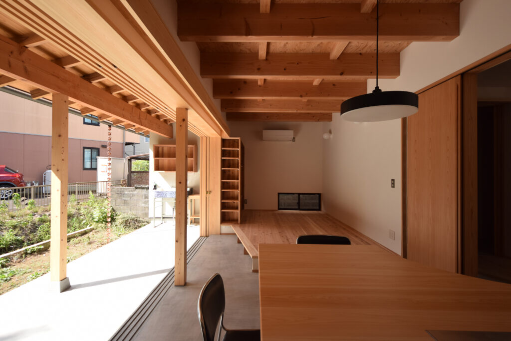 木製建具を全開放すると、お家の中にいるのか外にいるのか何とも言い難い”内でもなく外でもない不思議な空間”が広がる。そこを流れる時間がとても心地よく時の流れを忘れてしまうようだ。